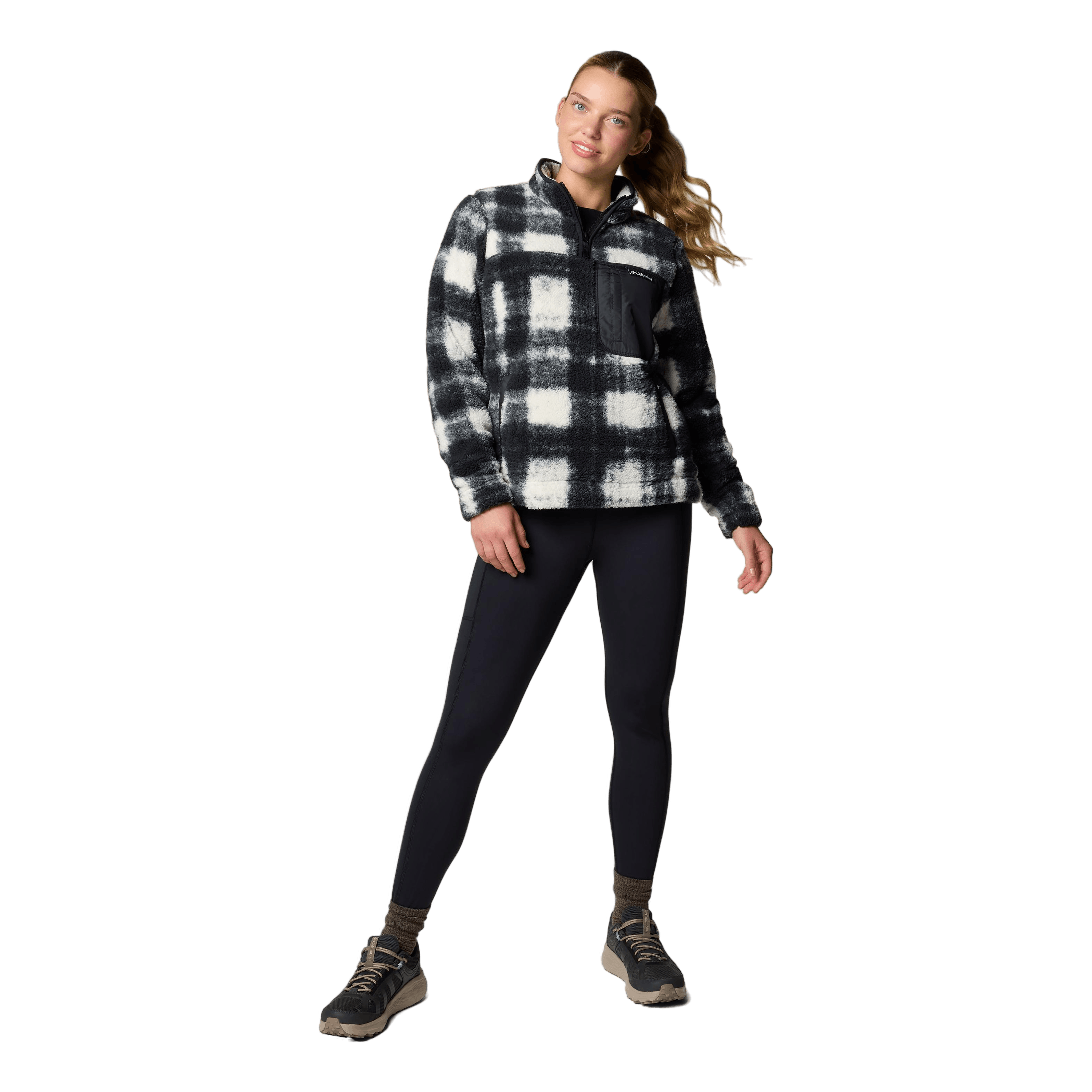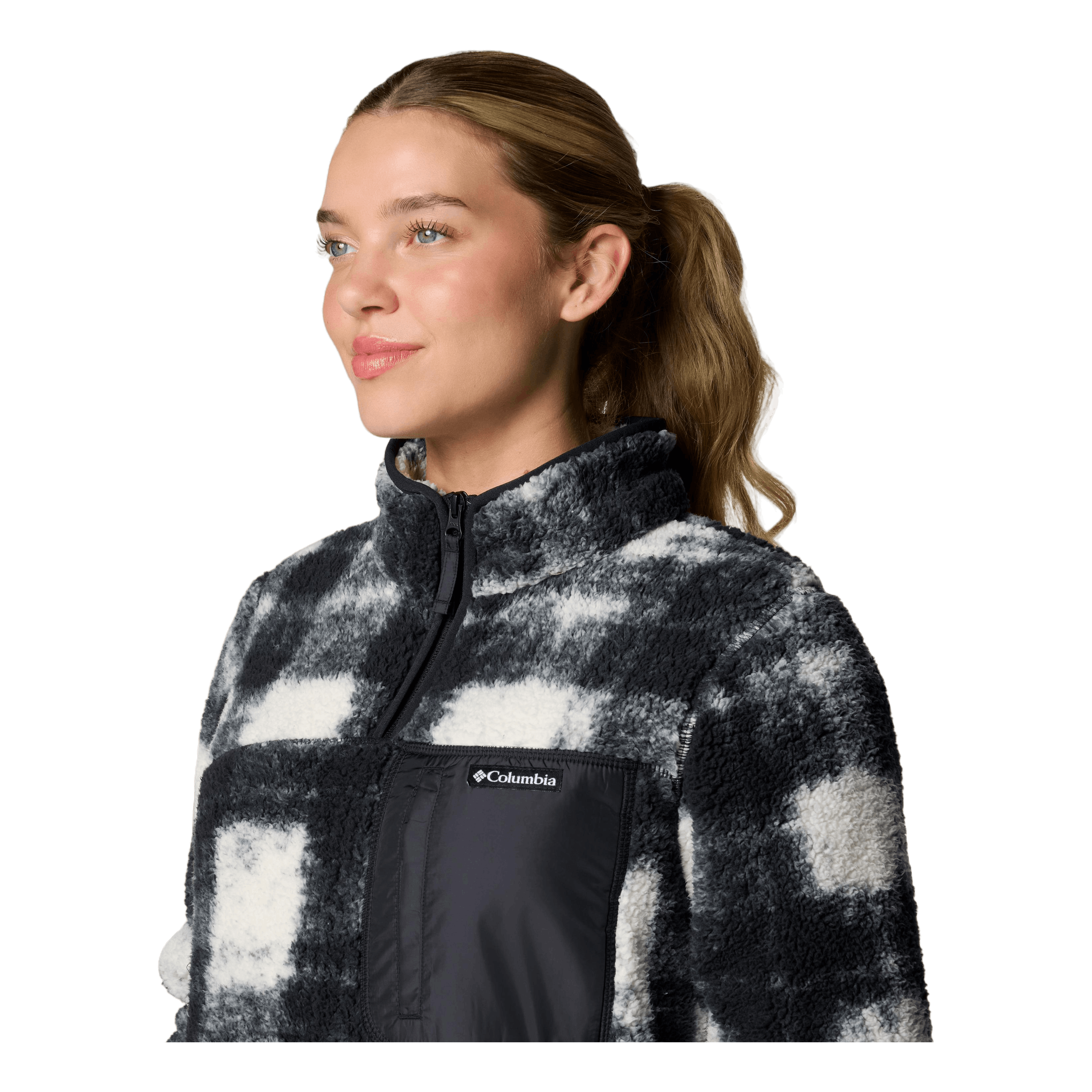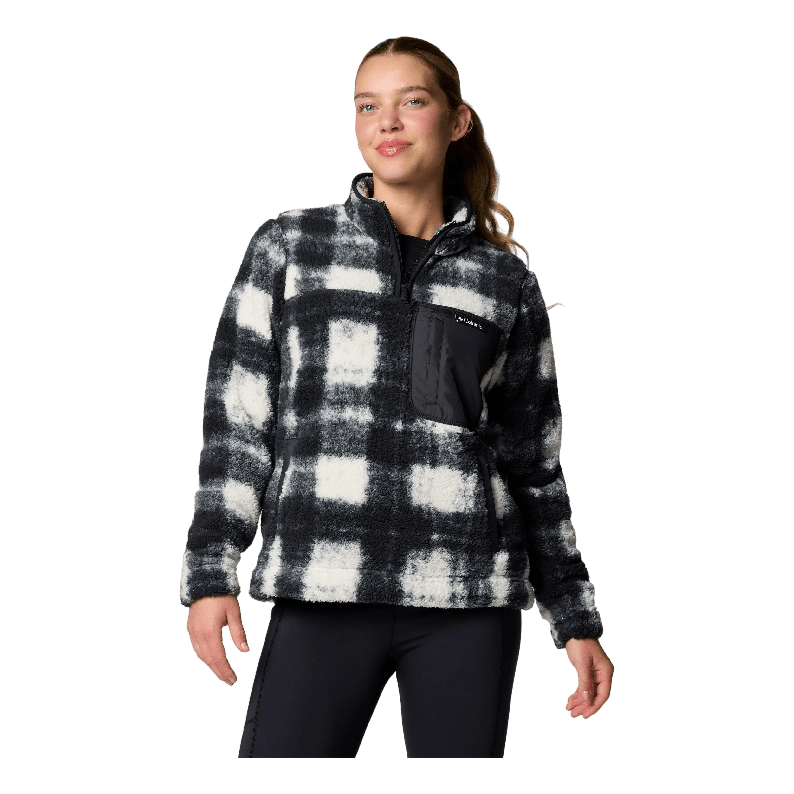 Manténgase abrigado y cómodo en los senderos con este cómodo polar Columbia para mujer con media cremallera, bolsillos tipo canguro y un práctico bolsillo con cremallera en el pecho.