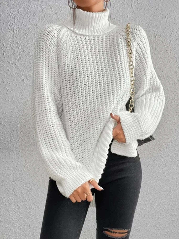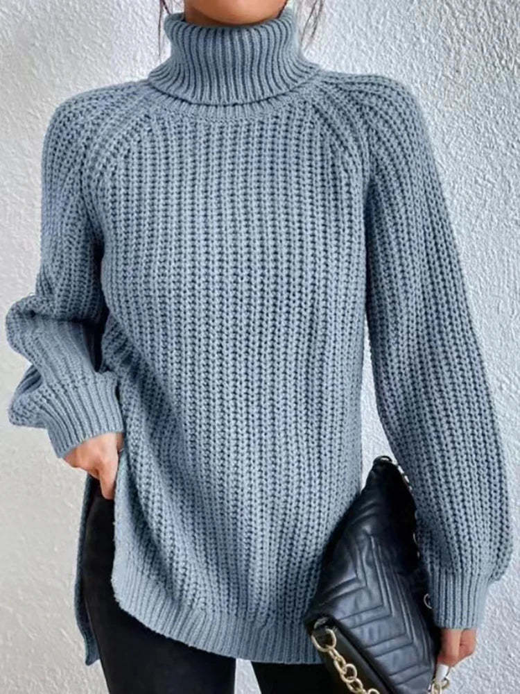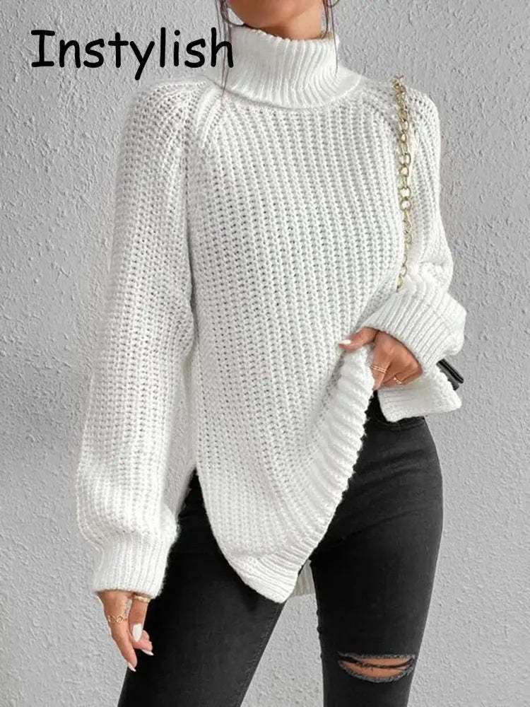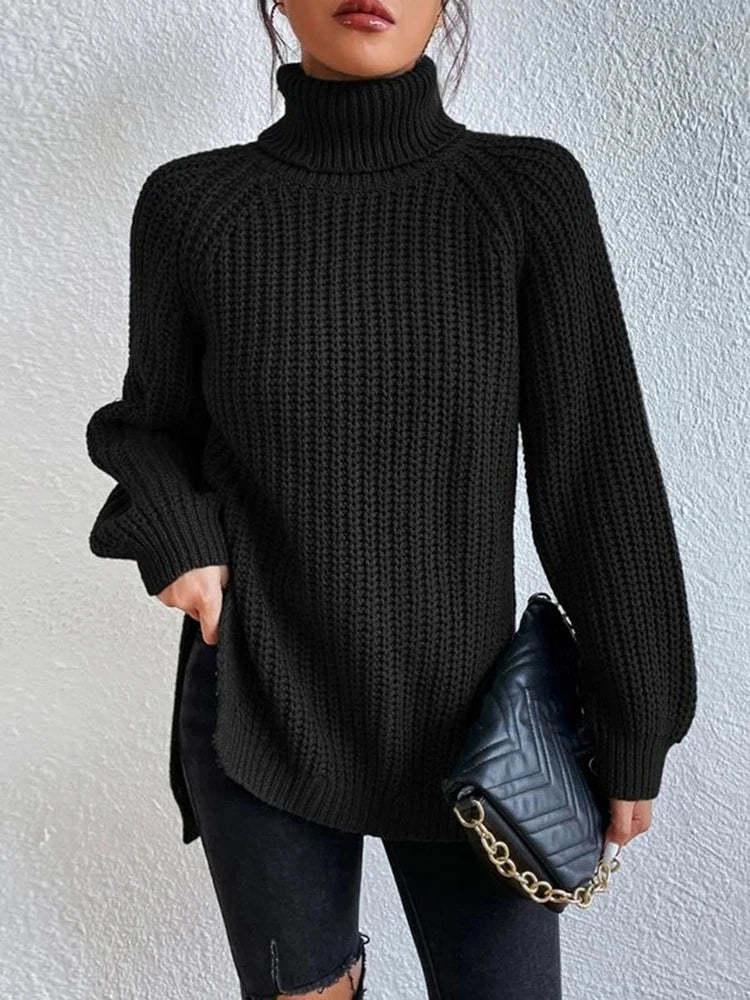 Women Winter Turtleneck Loose Sweater Elegant Drop Sleeve Side Split Pullover Vintage Harajuku Chic Jumpers Oversized knit Tops